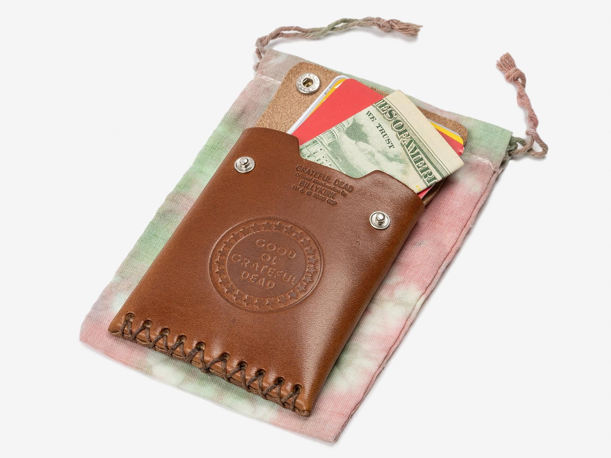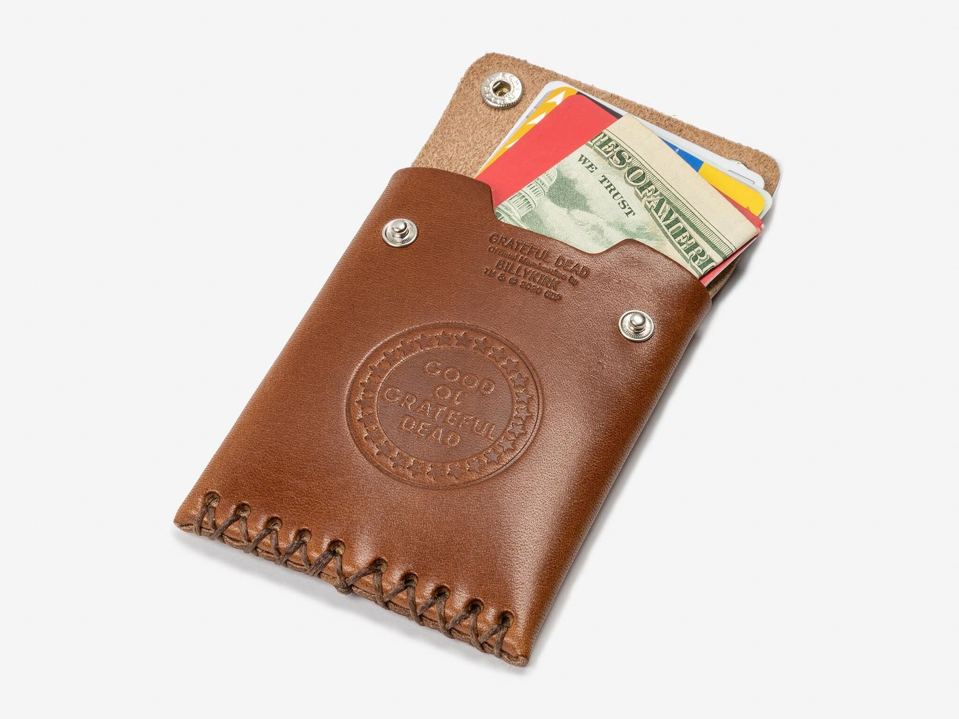 Card Case is a mash-up of modern and traditional featuring debossed Good Ol’ Grateful Dead design. The combination of hand stitching and metal snaps create a card case that’s both highly durable and practical. Made with American full grain leather and waxed cord, it’s a card case that’s built to last a lifetime.