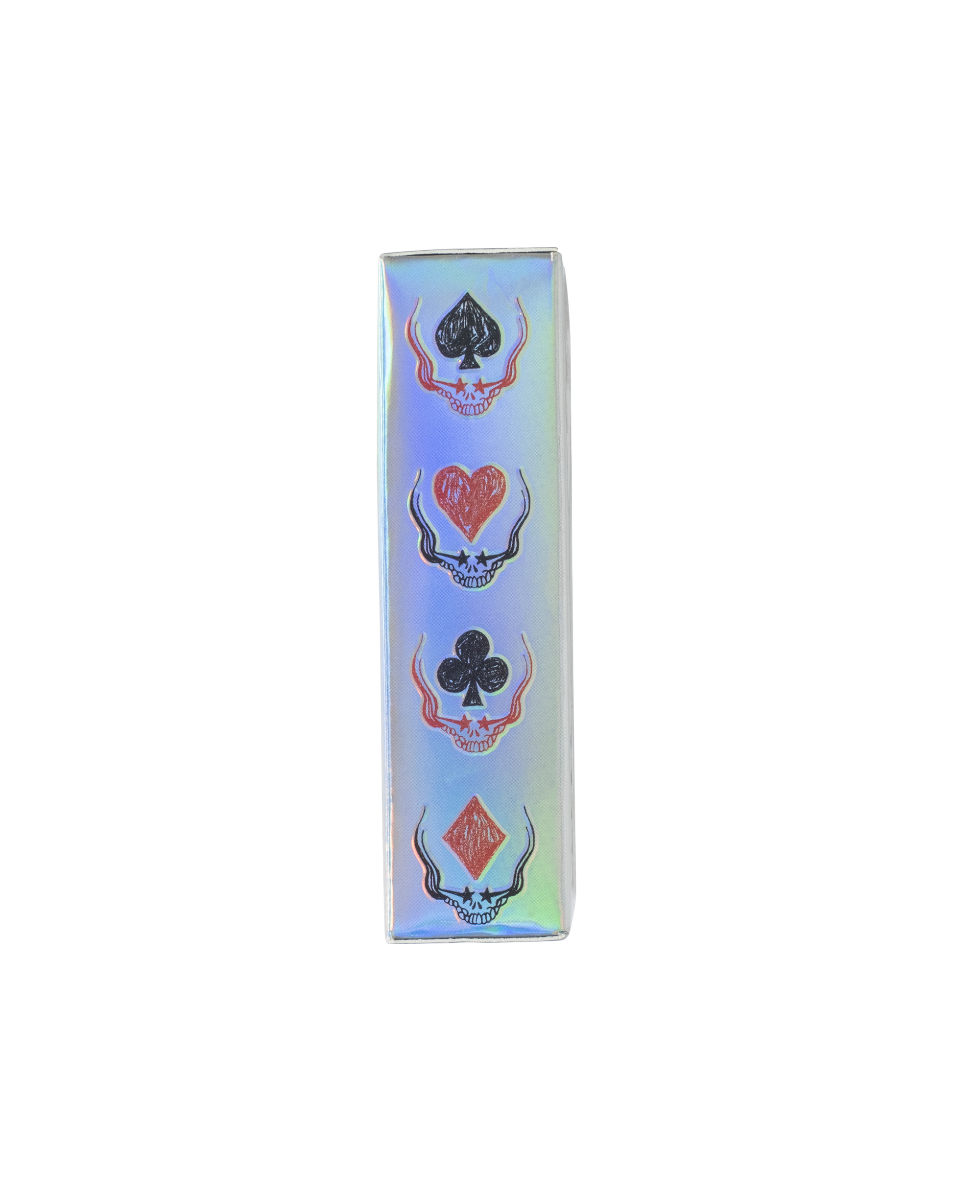 Stamped embossed effect & full color printing on box, inside and outside + silver foil on box with paper sticker for deck closure.