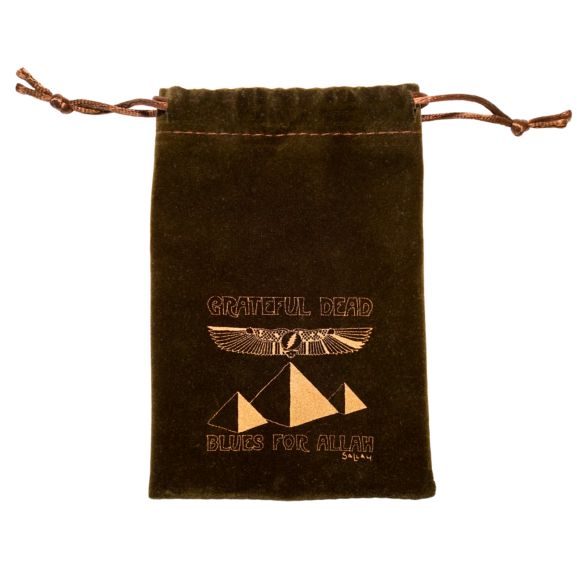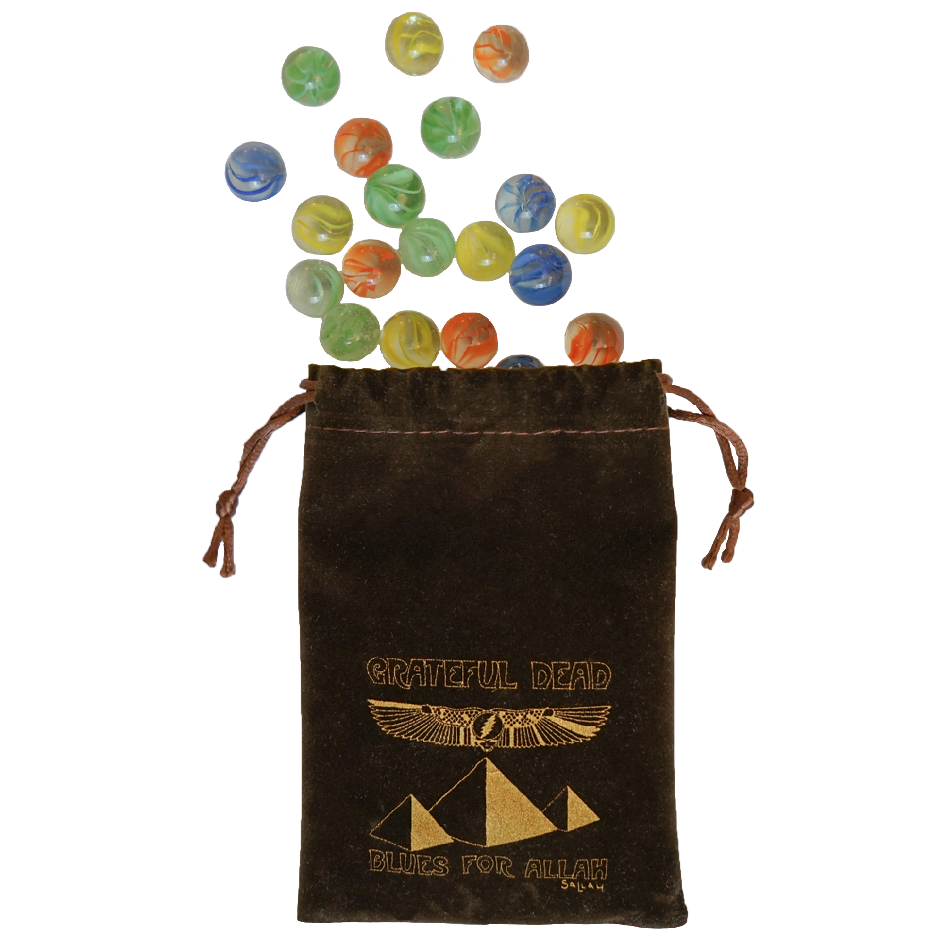 Set of 50 standard marbles in random assorted colors, packaged in faux velvet pouch printed with art inspired by Blues For Allah album.