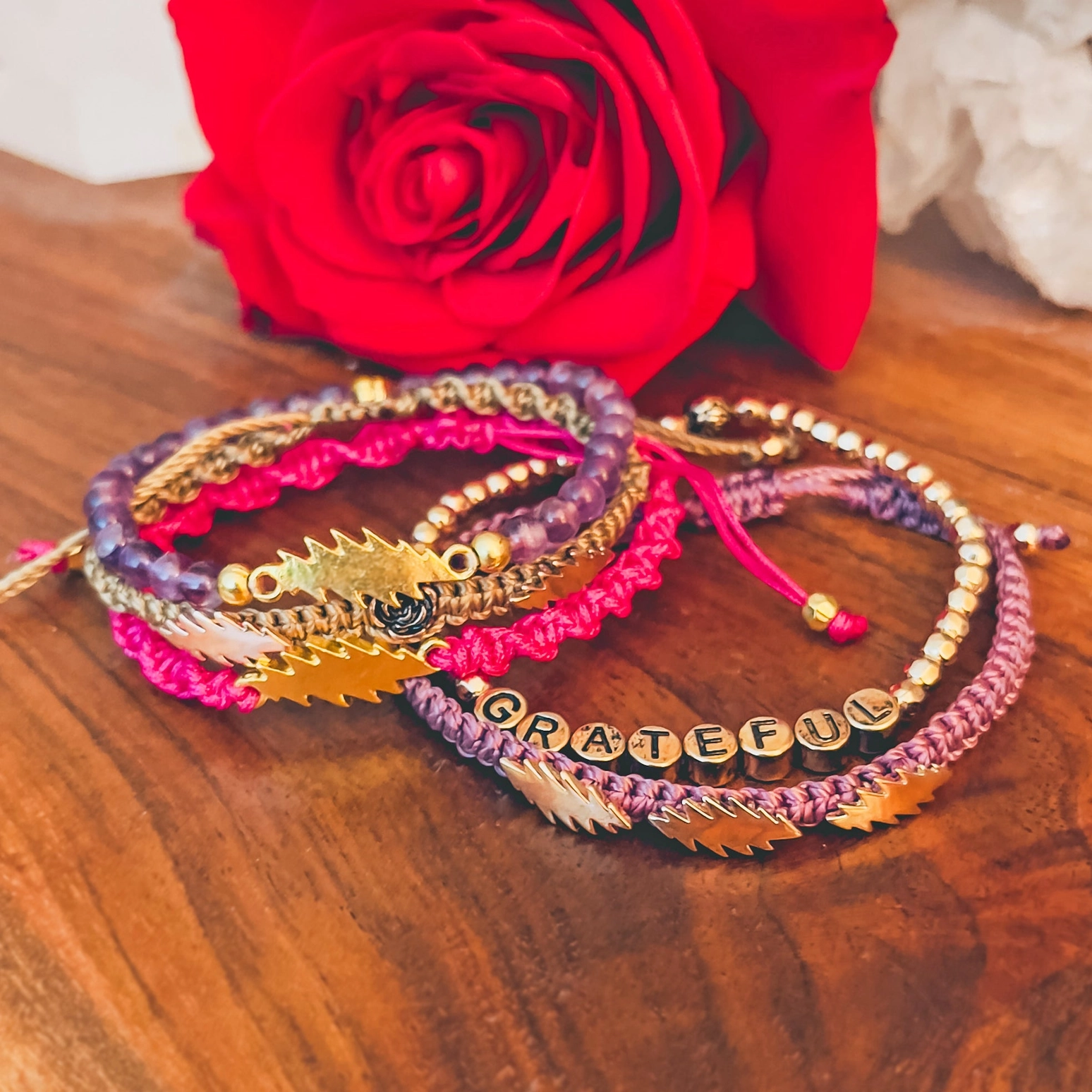 A mix of stretchy beaded bracelets and woven macrame bracelets with slipknot closure, in a vibrant, feminine pallet of pink, purple, and olive cords, gold, rose gold, and amethyst beads.